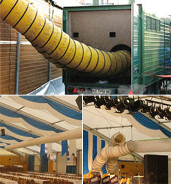 Durch ein speziell entwickeltes Heizsystem ist es auch bei extrem niedrigen Außentemperaturen noch möglich Ihre Veranstaltung im angenehm beheizten Zelt durchzuführen. Mit unserem modernen Zelt-Heizsystem wird Warmluft durch bis zu 60 Meter lange Schläuche gleichmäßig im Zelt verteilt.